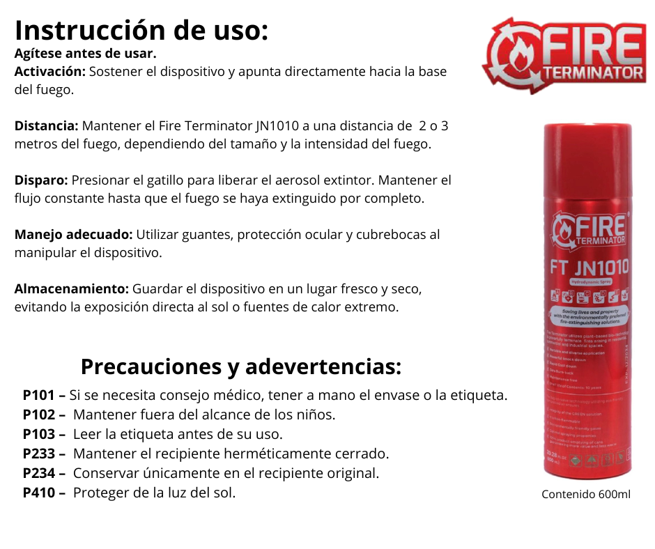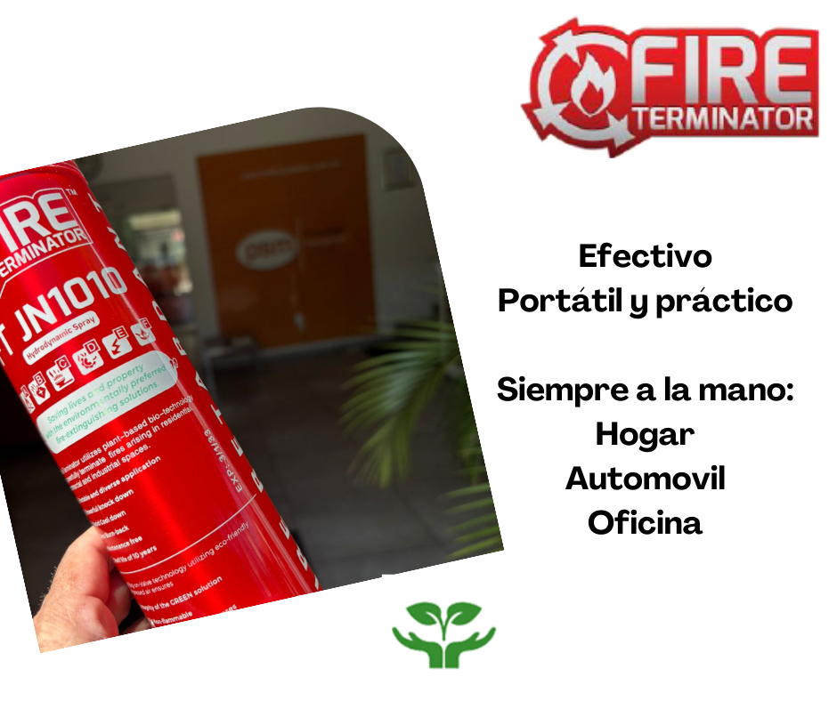 Fire Terminator es un extintor ecológico y biodegradable, no tóxico. Diseñado para sofocar incendios de manera rápida y segura. Su formato compacto lo hace ideal para el hogar, la industria y emergencias, permitiendo su fácil transporte en vehículos.